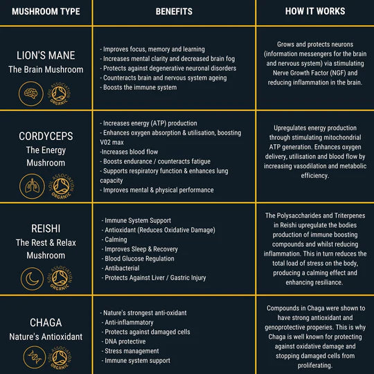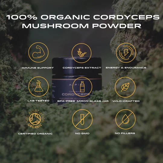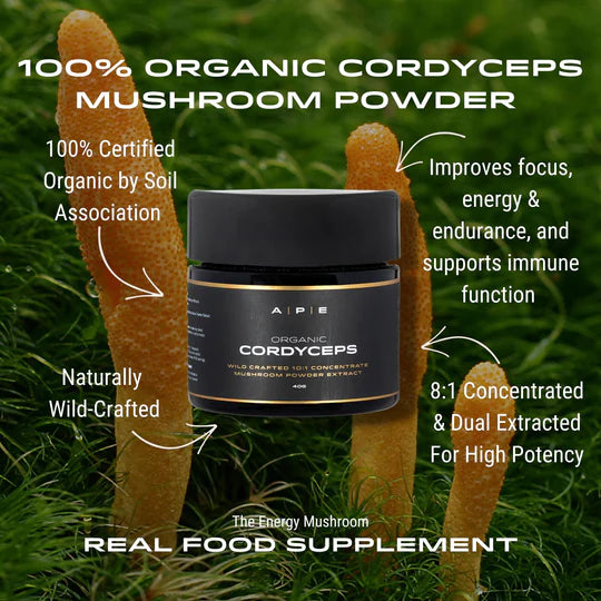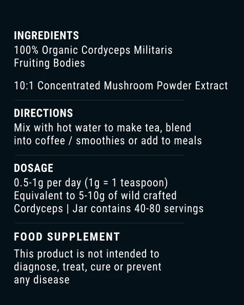 Cordyceps is an edible mushroom that when consumed has been shown to have a host of health and performance benefits. Studies have demonstrated its ability to promote oxygen uptake, energy and endurance as well as support immunity focus and blood sugar regulation. This is a 10:1 concentrated extract, which means we use 10g of raw Cordyceps to make 1g of powder. All our mushroom powder extracts are naturally wild-crafted, dual extracted and concentrated for maximum levels of beneficial compounds with no heavy metals or toxins.