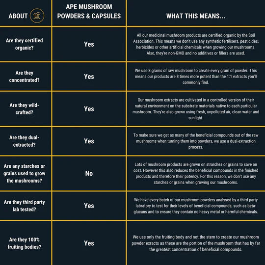 What makes our Cordyceps different? Our Cordyceps are made from 100% fruiting bodies, certified organic and wild-crafted with natural lighting and fresh air. We then use a dual-extraction and vacuum drying process to turn the mushrooms into an 10:1 concentrated extract powder.